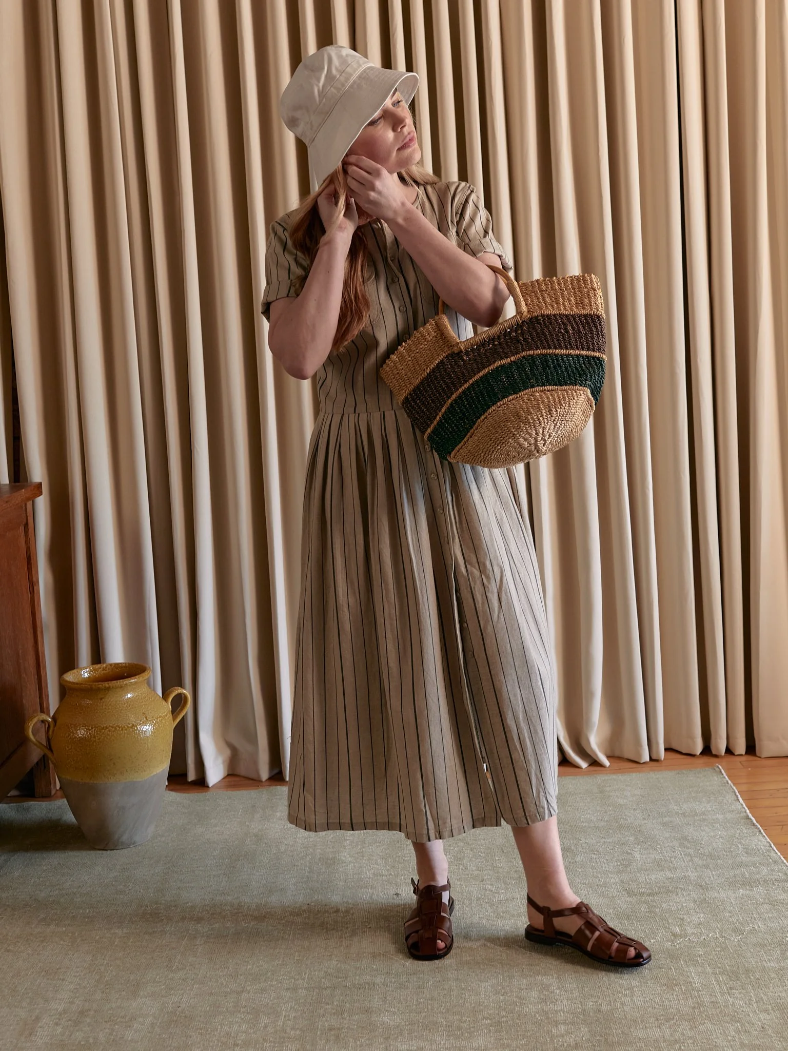 A versatile 80s/90s R&K Originals piece in a muted brown linen-rayon blend. Features a drop waist silhouette, structured interior shoulder pads, and wood button front closure. Unlined, with a minimalist design that makes it easy to style up or down. Size not marked, best fits a modern S/M.