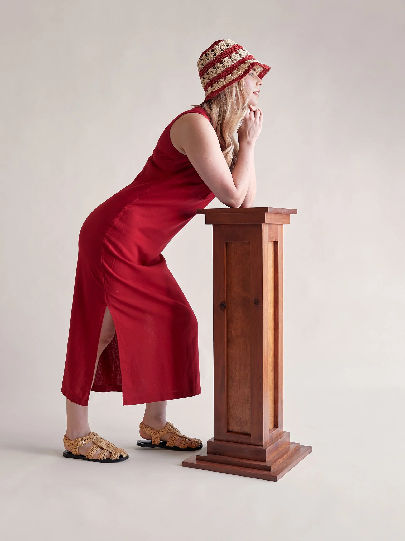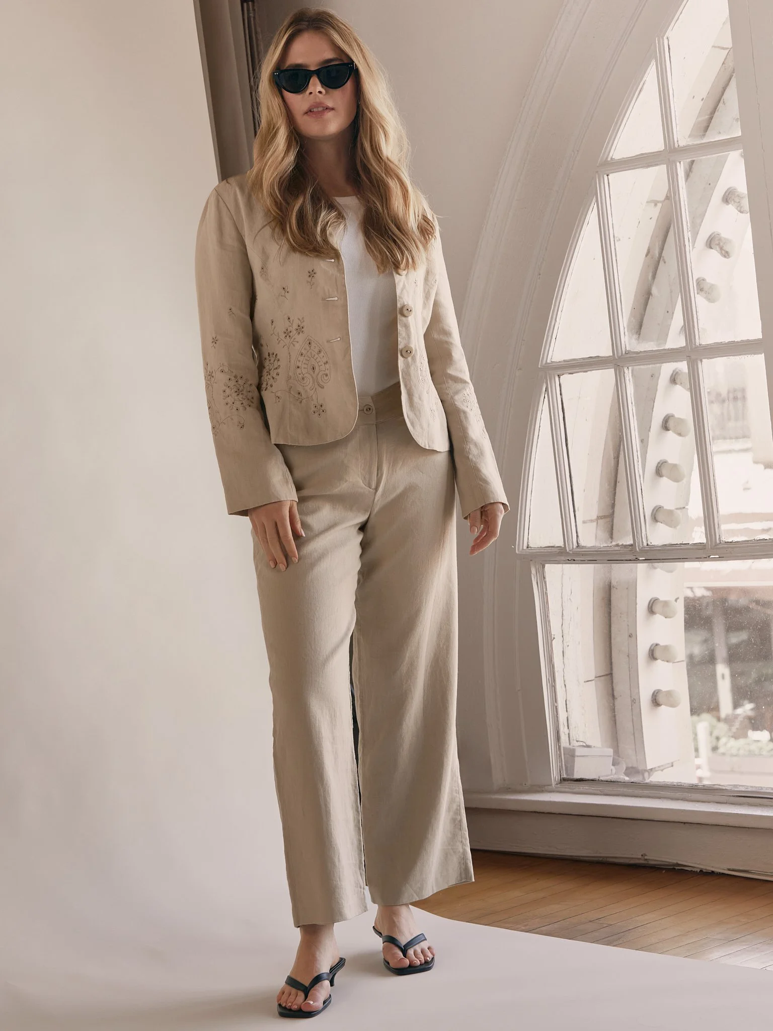 A cream linen coat from Susan Bristol, detailed with embroidered trim along the front, waist, and hem. Fully lined with hidden button closures for a clean silhouette. Made from 55% linen with a soft inner lining. Marked a size 10 but fits closer to a modern S/M (around a 6).