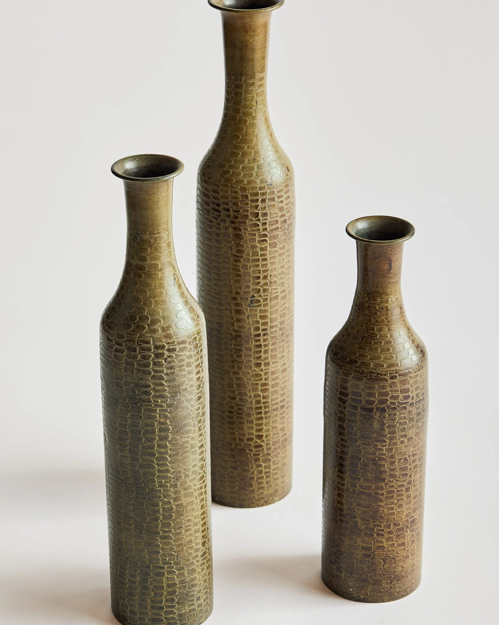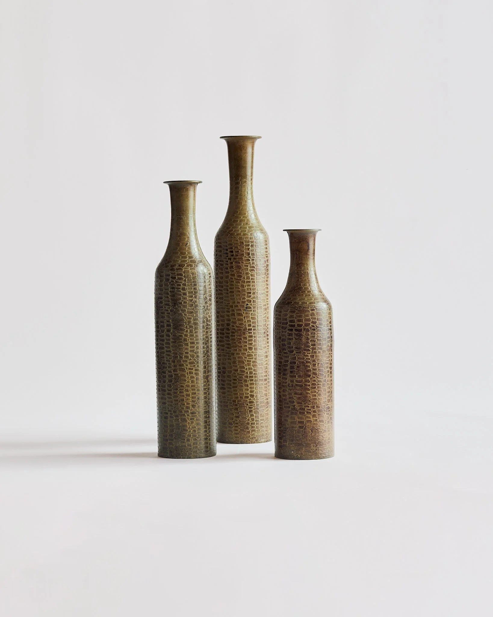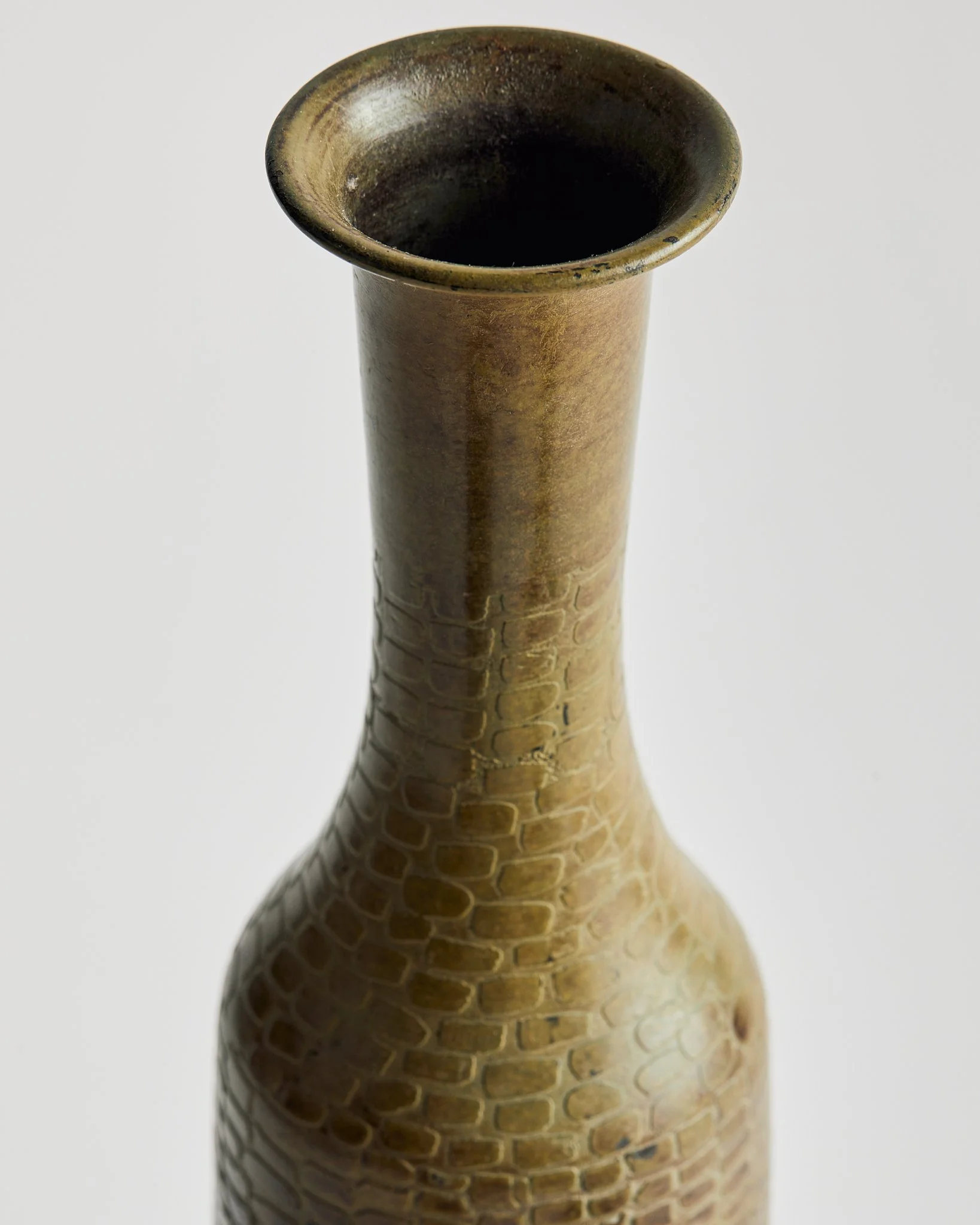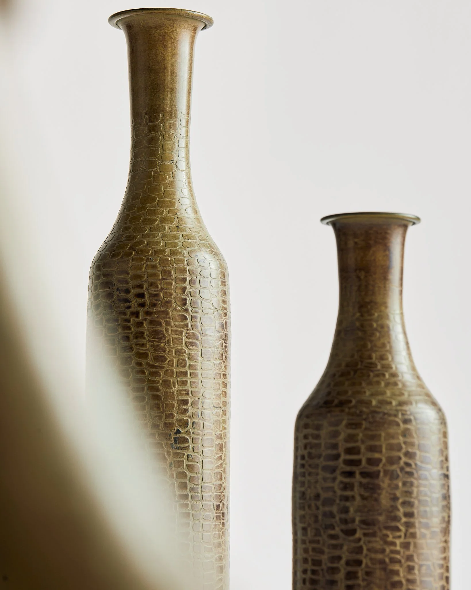 A striking two-tone ceramic vessel crafted in Italy, featuring a textured golden glaze on the upper half and a raw, natural clay finish below. Its amphora-inspired silhouette is accented with dual loop handles, blending rustic charm with timeless design. Perfect as a standalone floor piece or for displaying branches and large floral arrangements. Marked on the base with maker’s stamp, confirming Italian origin.